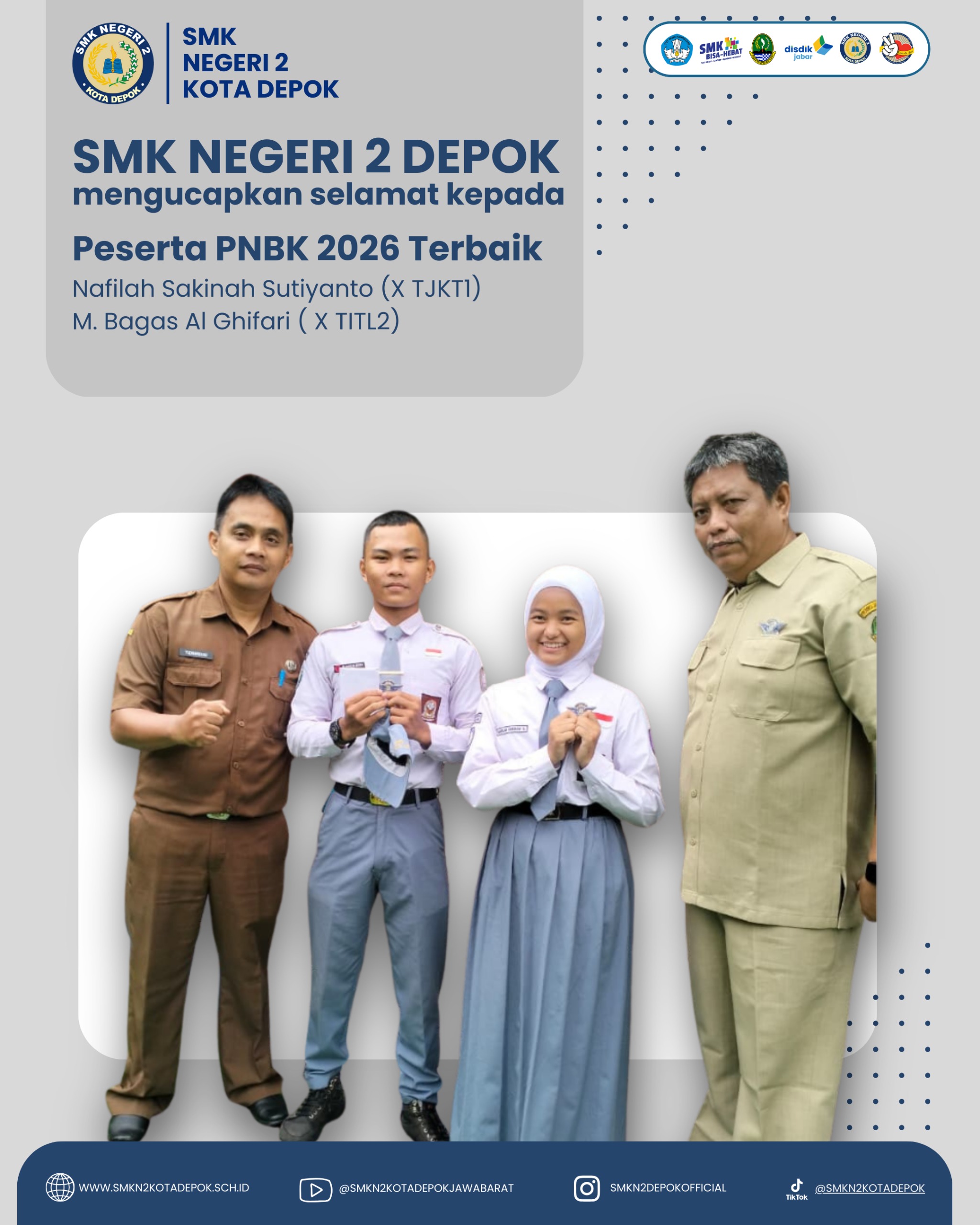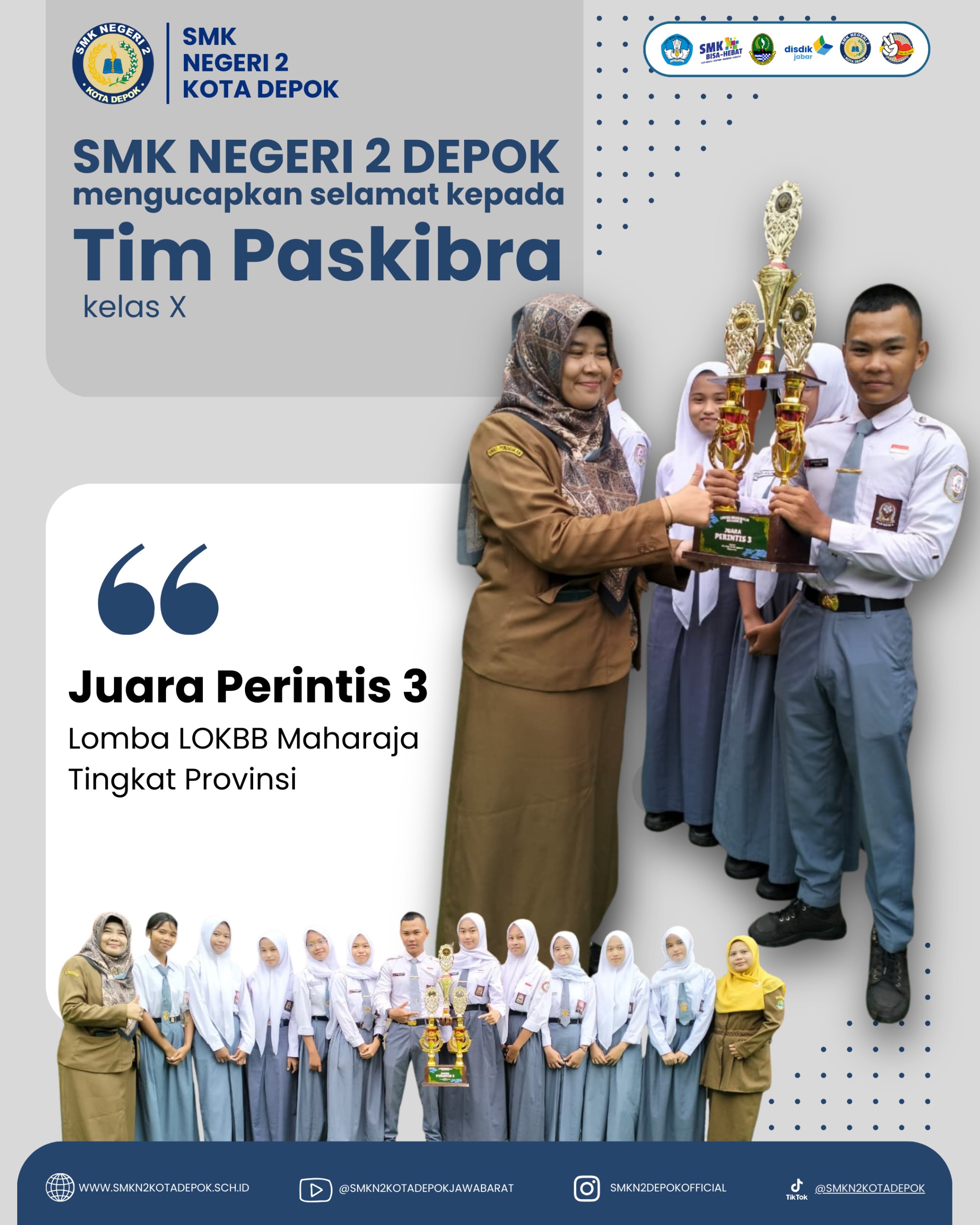 SMKN 2 Kota Depok adalah Sekolah Menengah Kejuruan yang berkomitmen mencetak lulusan yang berakhlak mulia , berkarakter panca waluya , terampil , kompeten, dan berdaya saing tinggi di dunia kerja maupun perguruan tinggi. Dengan tenaga pengajar profesional, fasilitas modern, serta kerja sama industri yang luas, SMKN 2 Kota Depok menjadi pilihan tepat bagi generasi muda untuk meraih masa depan gemilang.